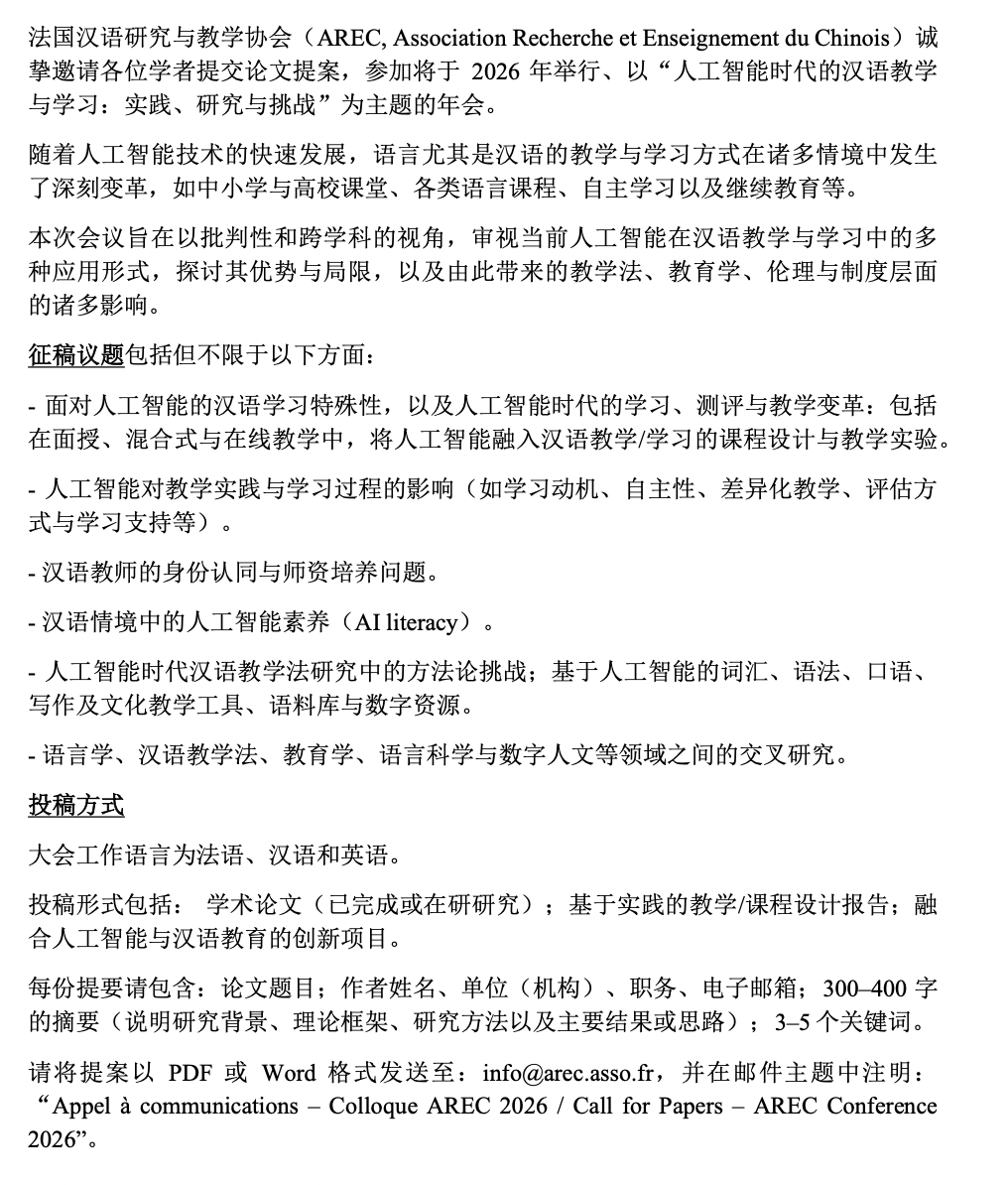 2026 年法国汉语研究与教学协会年会 2026 年 6 月 19–20 日 巴黎城市大学(Université Paris Cité)、法国国立东方语文明学院(INALCO)
