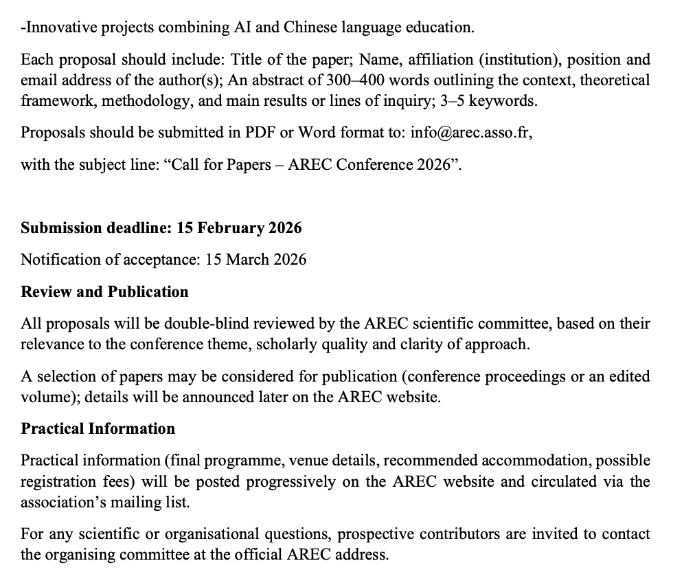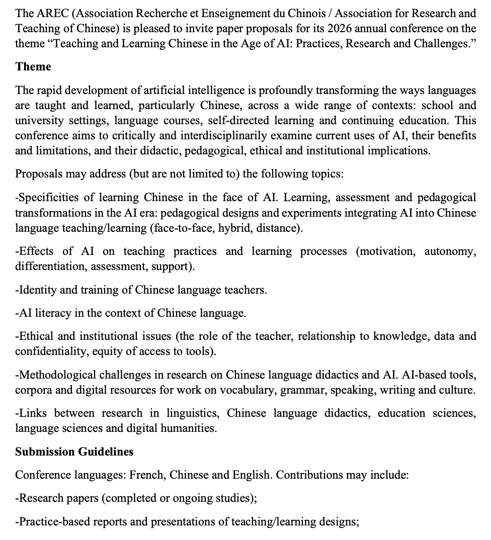 2026 (English) Teaching and Learning Chinese in the Age of AI: Practices, Research and Challenges 19–20 June 2026, Université Paris Cité, INALCO